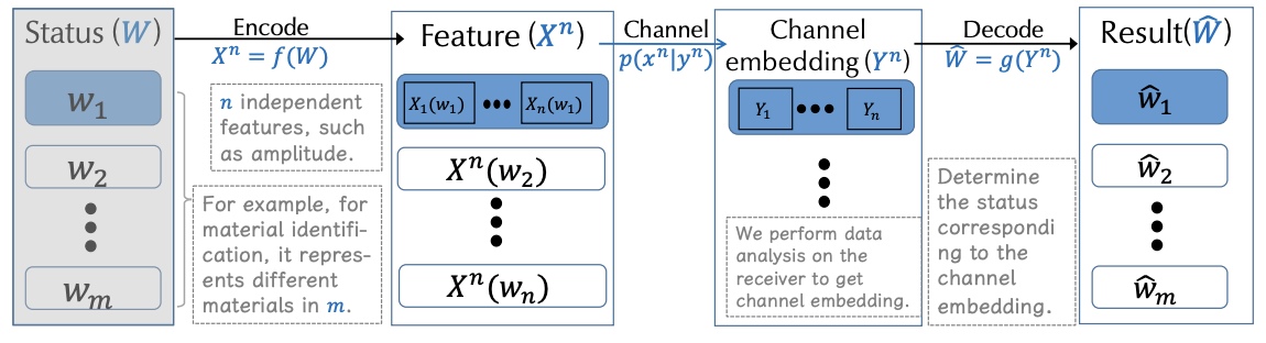 A typical sensing process often comprises several components: the target status to be sensed (\(W\)), the feature (\(X^n\)) designed to sense the status, the sensing channel embedding (\(Y^n\)) obtained through the sensing system, and the result (\(\hat{W}\)) derived after processing the signal.