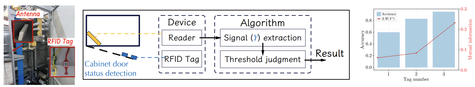 Given the cost-effectiveness and ease of deployment of RFID tags, we have developed an algorithm for monitoring cabinet door status using multiple tags. Furthermore, we employ the mutual information of tasks, as proposed in this paper, to assess the system’s performance.